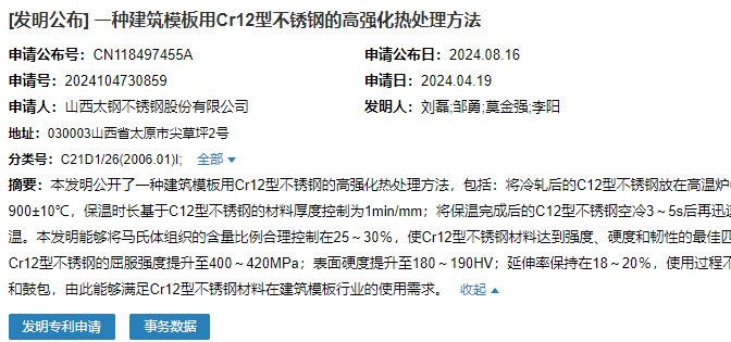 2024年8月16日,山西太鋼不銹鋼股份有限公司成功申請一項(xiàng)名為“一種建筑模板用Cr12型不銹鋼的高強(qiáng)化熱處理方法”專利,申請公布號為CN118497455A,申請日期為2024年4月19日。
