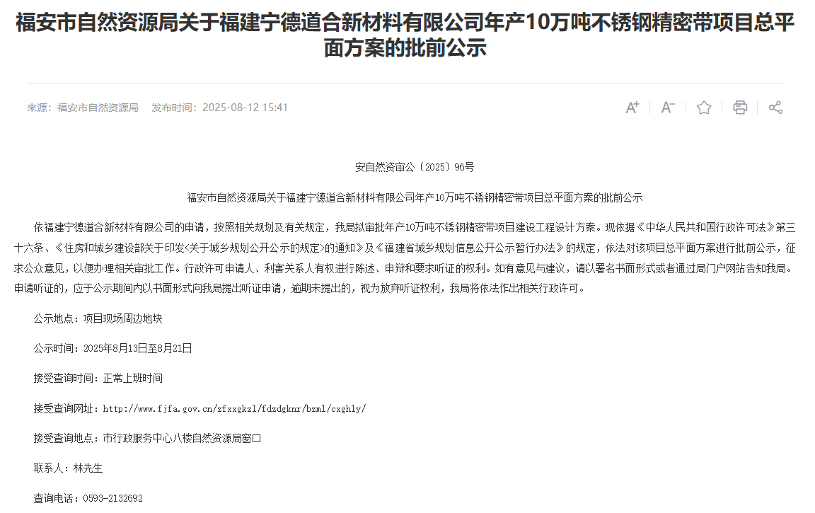 2025年8月12日,福安市自然資源局就福建寧德道合新材料有限公司年產(chǎn)10萬噸不銹鋼精密帶項(xiàng)目總平面方案對(duì)外進(jìn)行批前公示,公示時(shí)間:2025年8月13日至8月21日。
